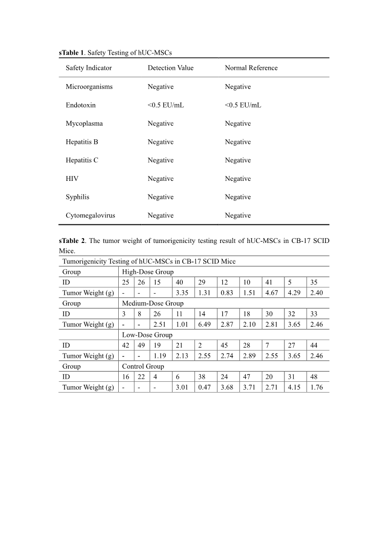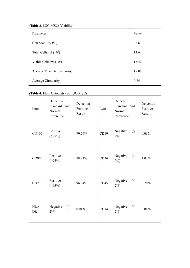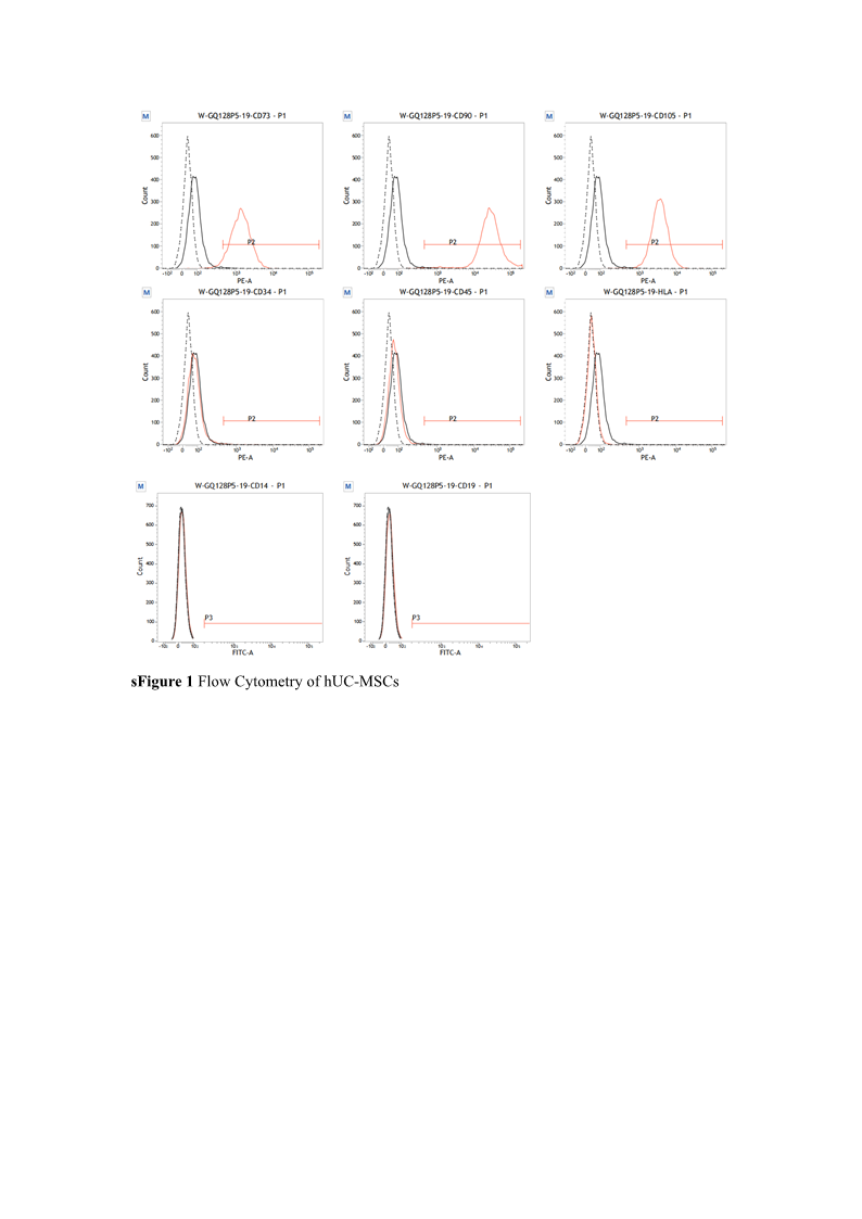Flow cytometry analysis confirmed that hUC-MSCs exhibited characteristic surface marker associated with mesenchymal stem cells, with positive (≥ 95%) for key markers such as CD105, CD90, and CD73 and negative (≤ 2%) for hematopoietic and endothelial markers such as CD19, CD34, CD45 and Human Leukocyte Antigen-DR (HLA-DR). Moreover, safety evaluations encompassed rigorous testing for microbial contamination, endotoxins, mycoplasma and various pathogens, including hepatitis B and C viruses, HIV, syphilis and cytomegalovirus.