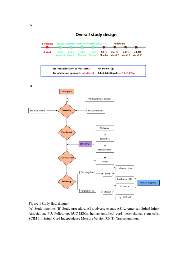 10–14. Human umbilical cord mesenchymal stem cells (hUC-MSCs) are considered a promising therapeutic candidate for intractable SCI due to numerous advantages, including paracrine ability15, homing capacity16, low immunogenicity17, and anti-fibrosis activity18. These advantages make it becomes a highly suitable candidate for SCI treatment19–25. Our preclinical studies26 using a rat SCI model demonstrated that subarachnoid transplantation of hUC-MSCs had minimal risk and offered significant benefits. However, high-quality data from well-designed studies are still lacking.